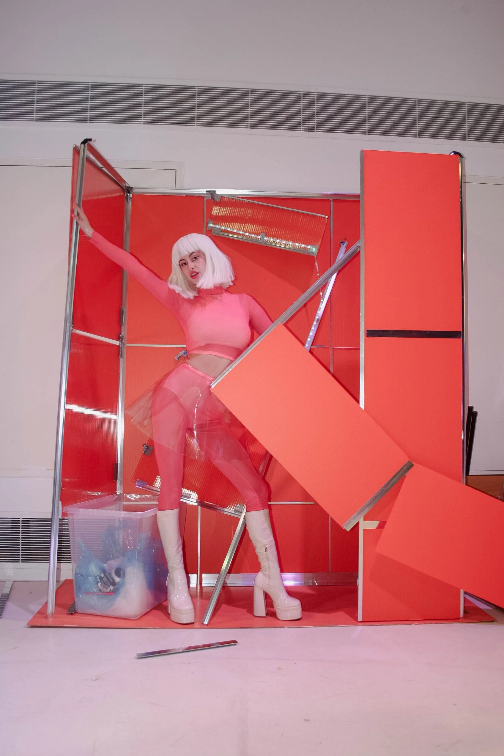 This work is entirely flat packable, it started with ideas of utilising rip stop fabric but as I want to bring the piece to festivals I quickly realised that it would get mistaken for someone’s actual tent. I then settled on polycarbonate which is durable and light, then vinylled over to give a slick futuristic look. The aesthetic is heavily influenced by retro futurism, making the costume feel like it’s not too far away but also layered with nostalgia for the past. The sleekness of the piece is again, offset with trash where the performer stands, highlighting rising sea levels whilst they perform a ‘peep show’.